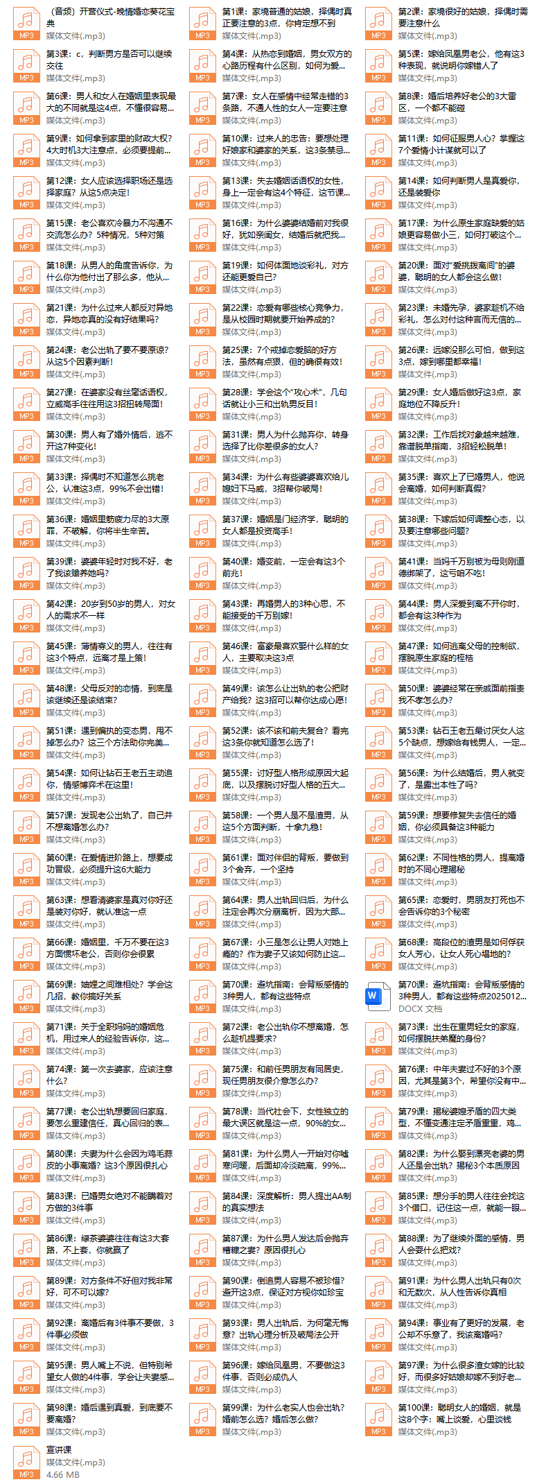 第100课:聪明女人的婚姻,就是这8个字:嘴上谈爱,心里谈钱.mp3